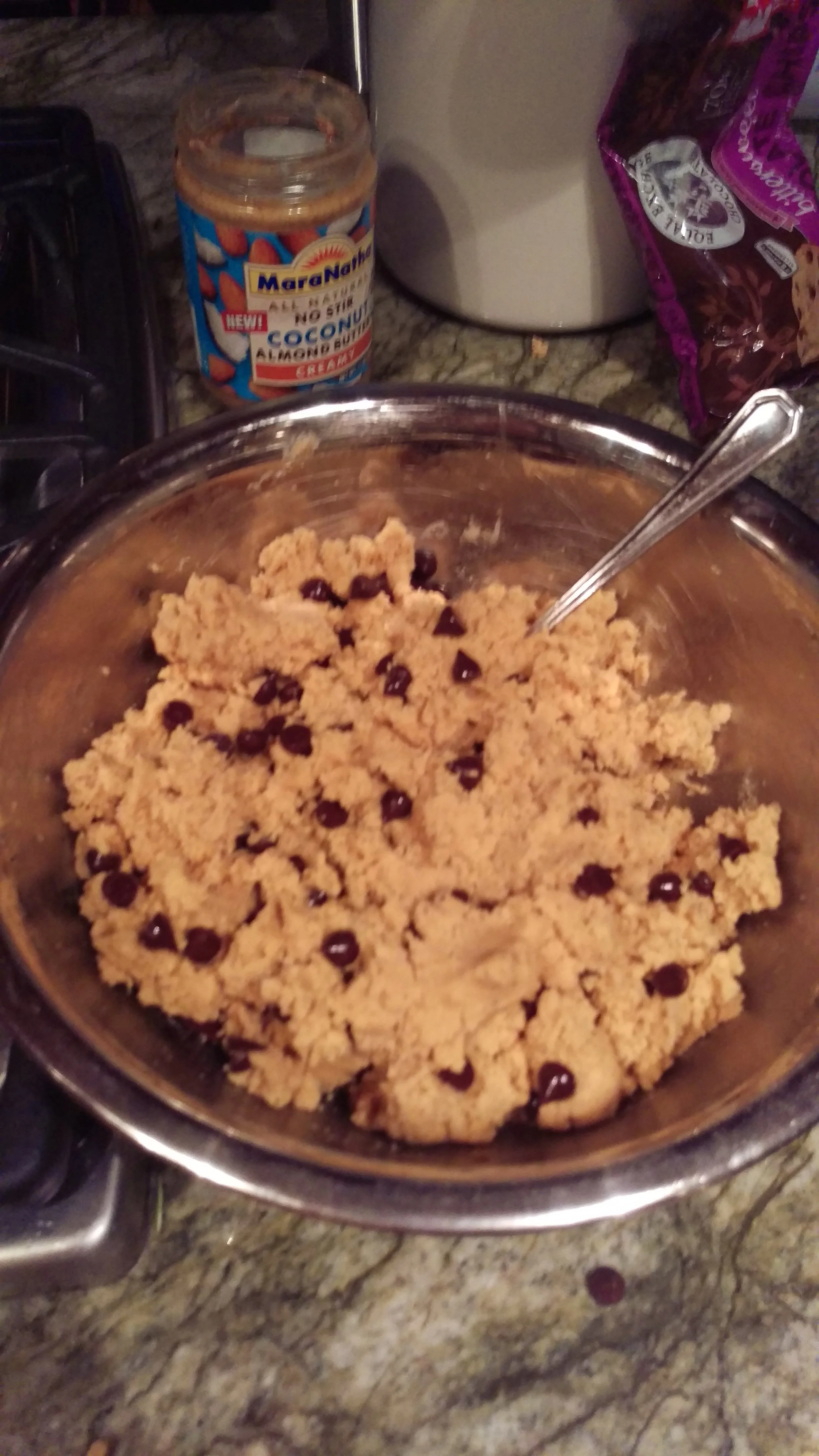 - Mix in baking soda and salt. Fold in almond flour, coconut flour and protein powder one at a time, making sure to mix each new addition thoroughly before adding in your chocolate chunks. Douse dough mix with lots of Love.